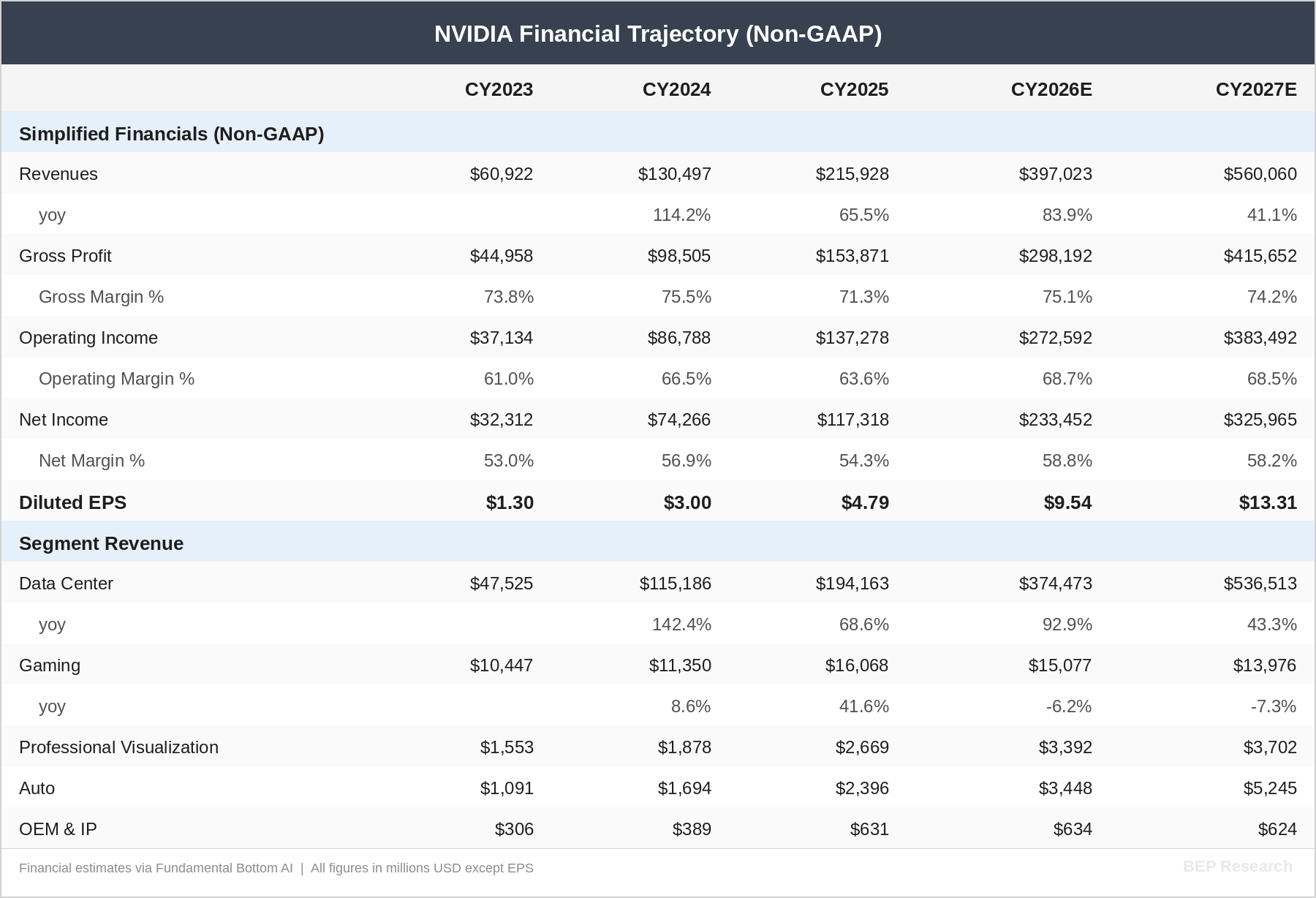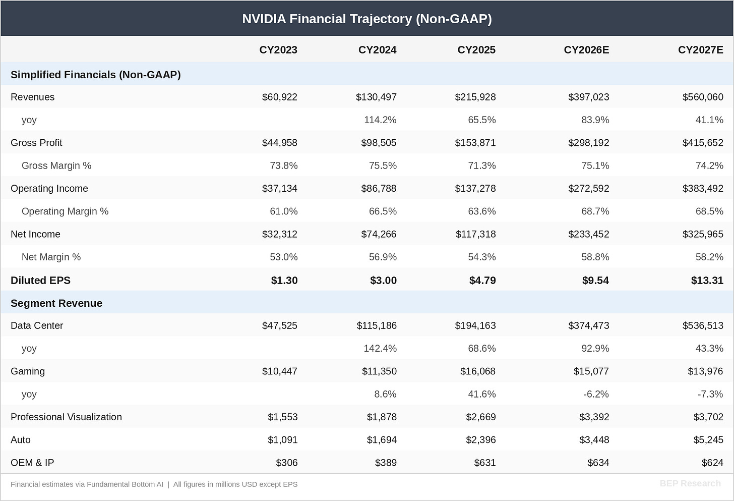 The street models I track closely, including FundaAI’s detailed build, project NVIDIA’s Data Center revenue reaching approximately $537 billion by CY2027, representing roughly 43% year-over-year growth off an estimated $374 billion in CY2026. That trajectory implies total company revenue approaching $560 billion with EPS of approximately $13.30—putting the stock at roughly 14× forward earnings on CY2027 numbers.