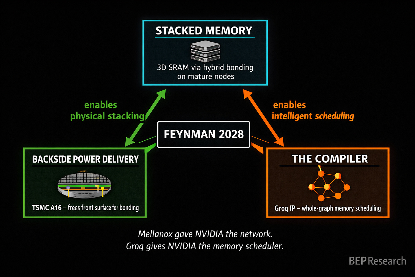 I’ve been thinking about this deal through the acquisition lens, and here’s where I’ll plant a flag: Groq could be as instrumental to NVIDIA as Mellanox was. Mellanox gave NVIDIA the networking fabric that turned individual GPUs into a datacenter-scale compute platform—it was the connective tissue that made NVLink, InfiniBand, and eventually the NVL72 rack architecture possible. Without Mellanox, NVIDIA sells chips. With Mellanox, NVIDIA sells systems. The Groq IP may do the same thing for the memory hierarchy. It gives NVIDIA the compiler intelligence to turn a heterogeneous stack of HBM, stacked SRAM, and system memory into a unified, software-scheduled memory platform. Without Groq’s scheduling insights, the stacked memory architecture is fast but dumb. With them, it becomes a system that knows where every byte should live and when it should move. That’s the difference between selling silicon and selling inference infrastructure.
