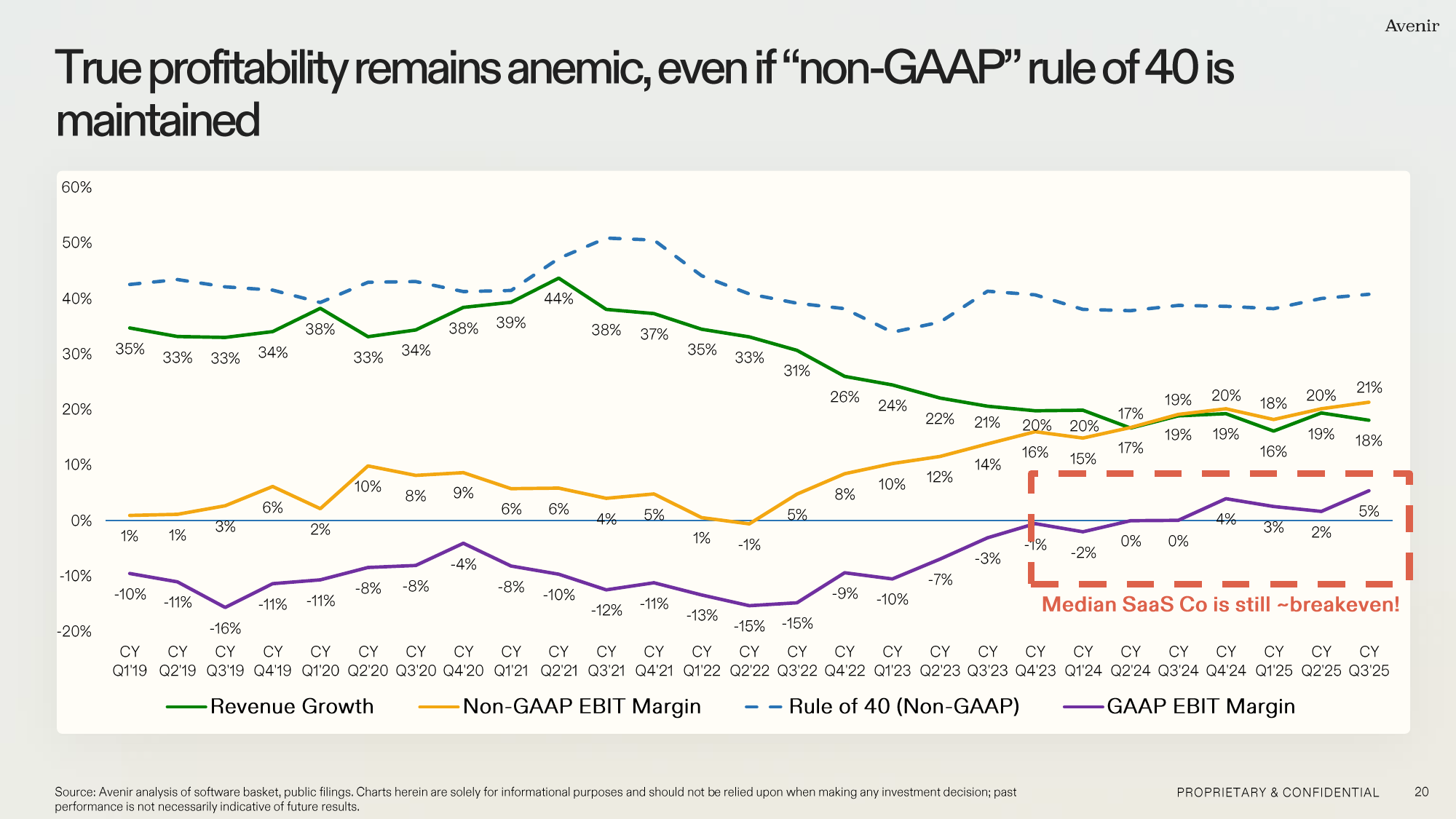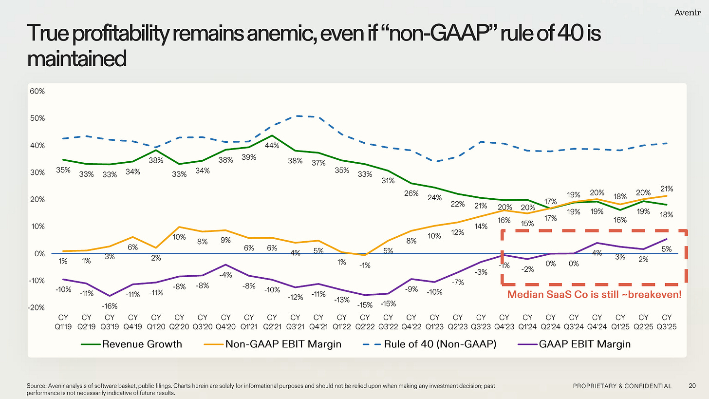 The Avenir data tells the story. The median public SaaS company maintains a non-GAAP Rule of 40 score around 40%—technically healthy. But their GAAP EBIT margins hover around 5%. The median SaaS company is essentially breakeven on a real economic basis, even after a decade of supposed “scaling.”