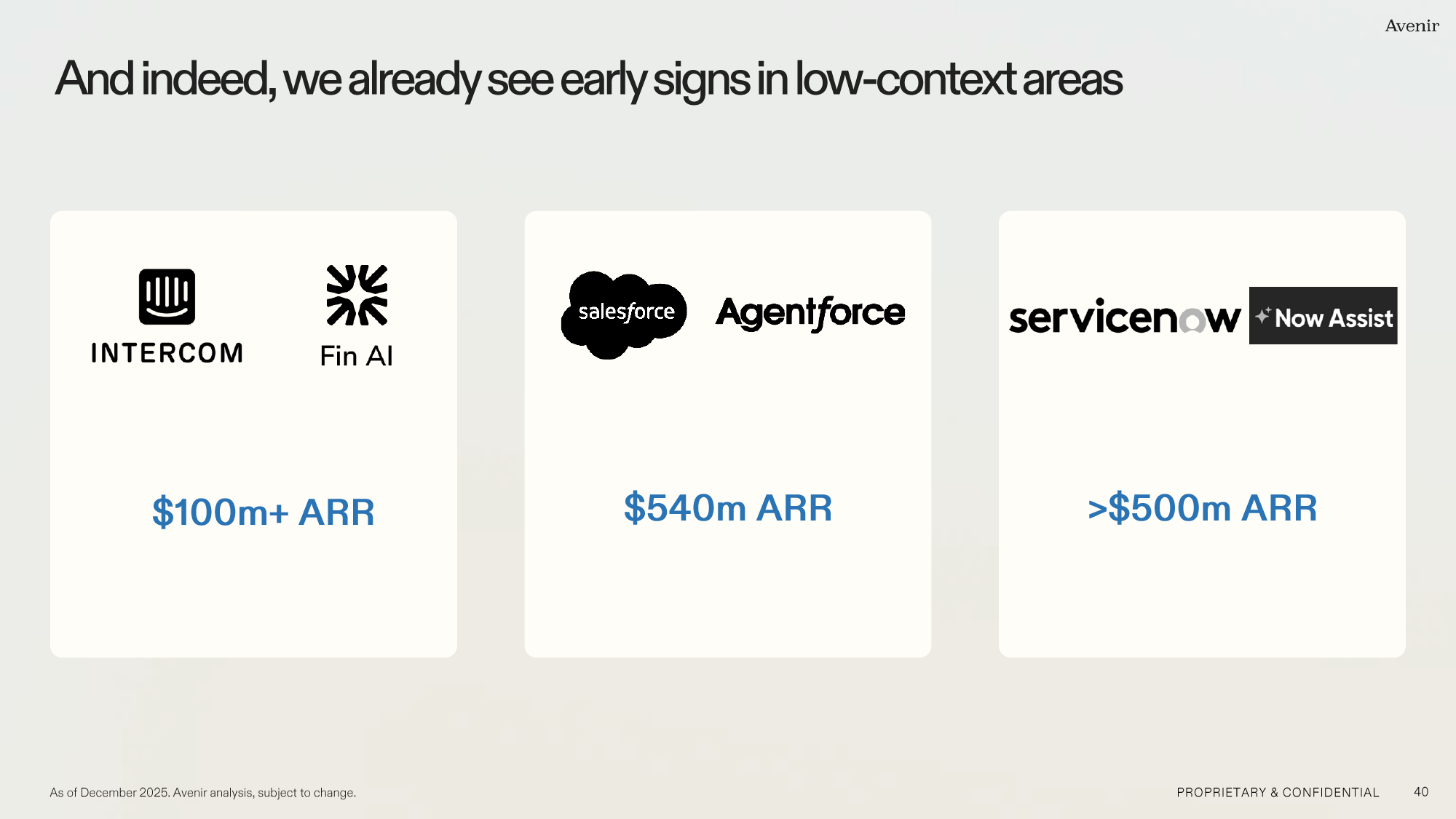 Salesforce’s Agentforce has reached $540 million ARR. ServiceNow’s Now Assist surpassed $600 million in net new ACV in Q4, exceeding expectations. Intercom’s Fin AI tops $100 million ARR.