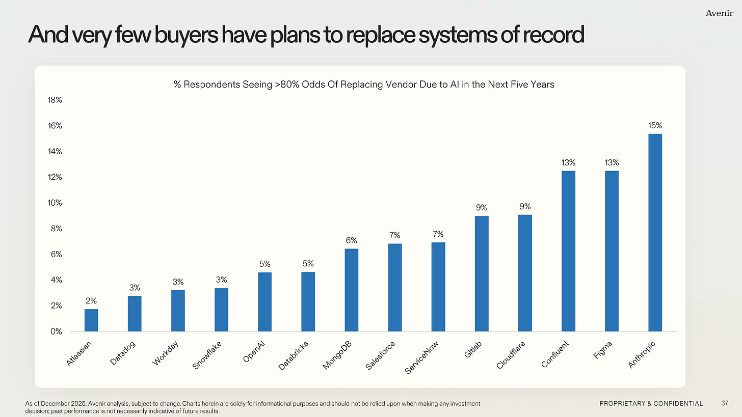 Even more telling: when asked about the probability of replacing specific vendors due to AI in the next five years, the numbers are remarkably low. Only 2% see >80% odds of replacing Atlassian. 3% for Workday. 6% for Salesforce. 7% for ServiceNow.