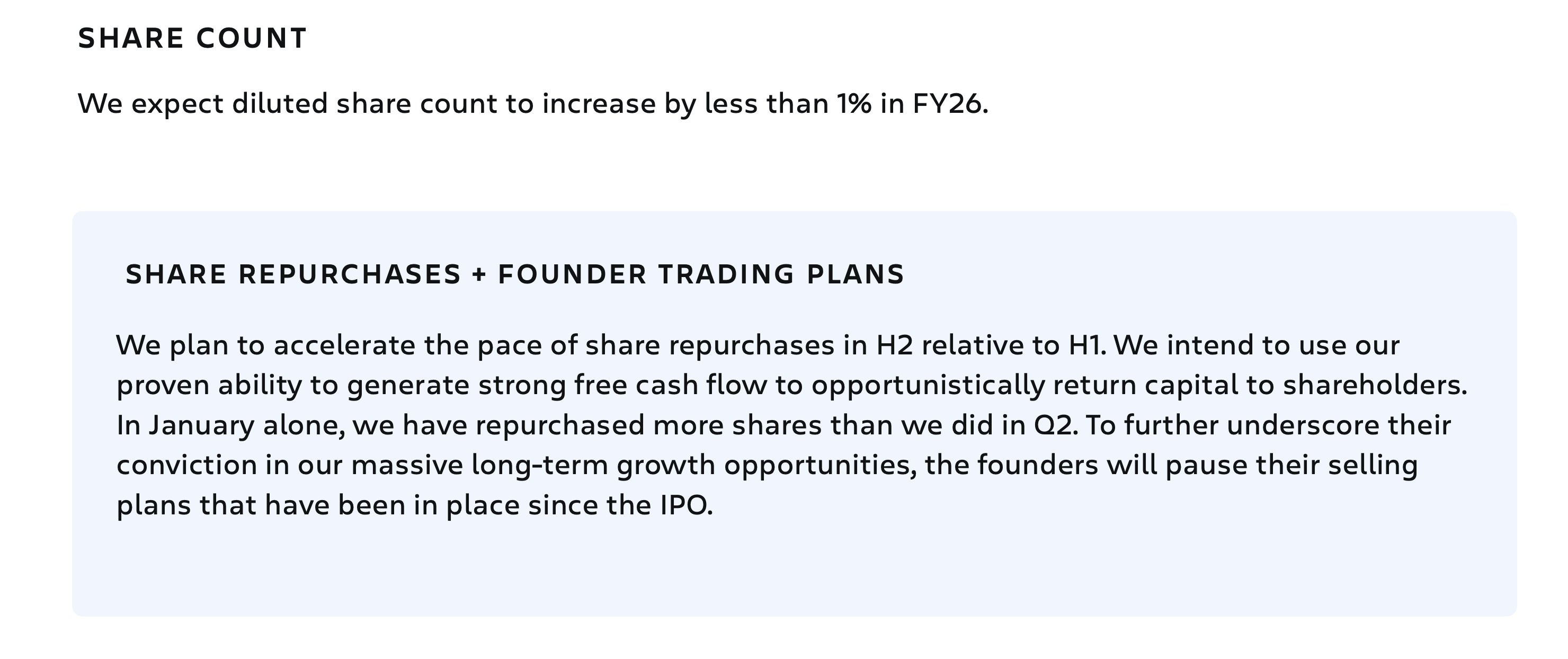 To their credit, some companies are getting the message. Atlassian announced this week that founders will pause their selling plans that have been in place since IPO, and the company has already repurchased more shares in January alone than all of Q2. Their shareholder letter framed it as a way “to further underscore their conviction in our massive long-term growth opportunities.” Translation: we know the SBC optics are terrible and we’re trying to offset it. But one company’s mea culpa doesn’t fix an industry-wide problem.