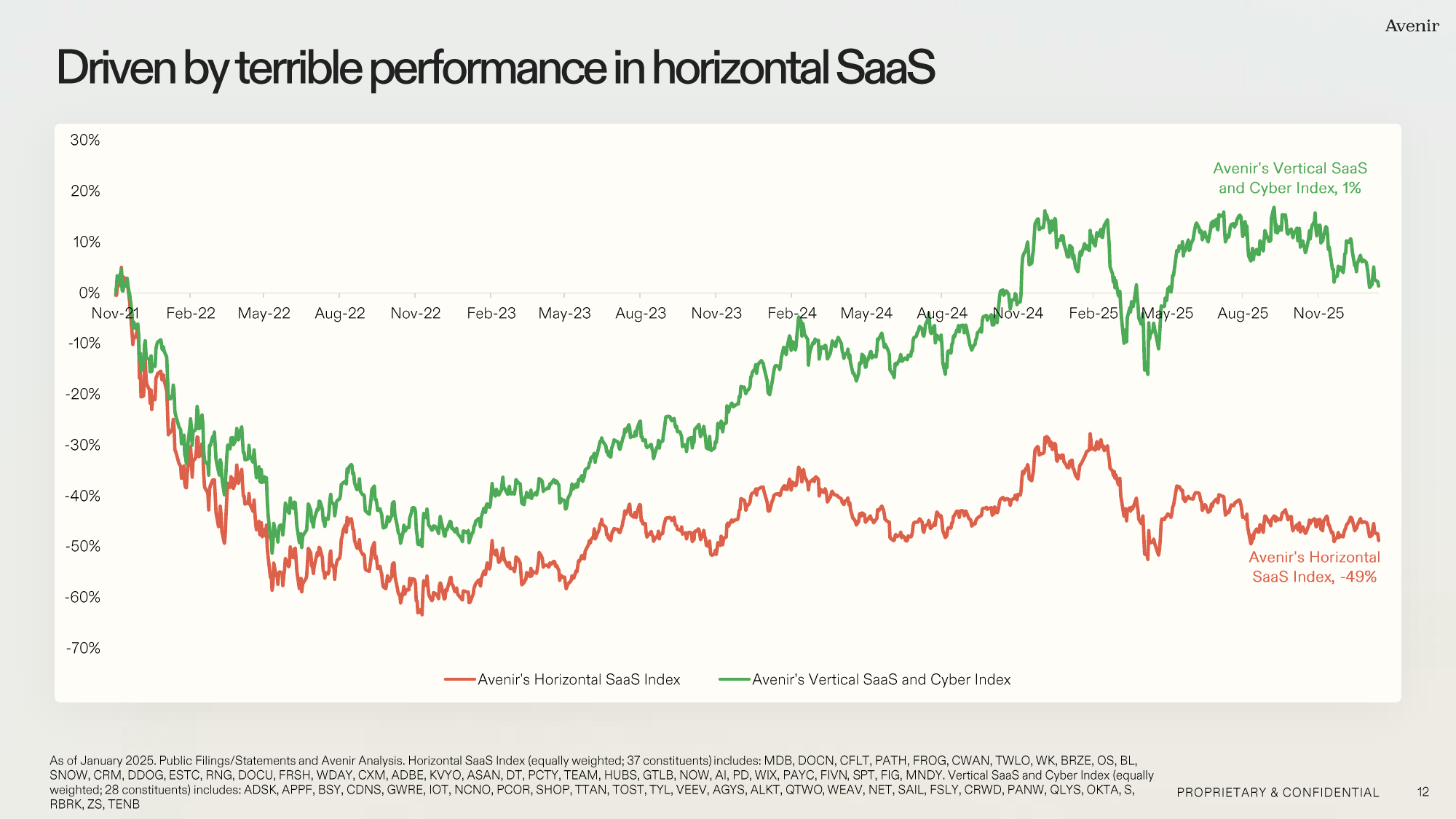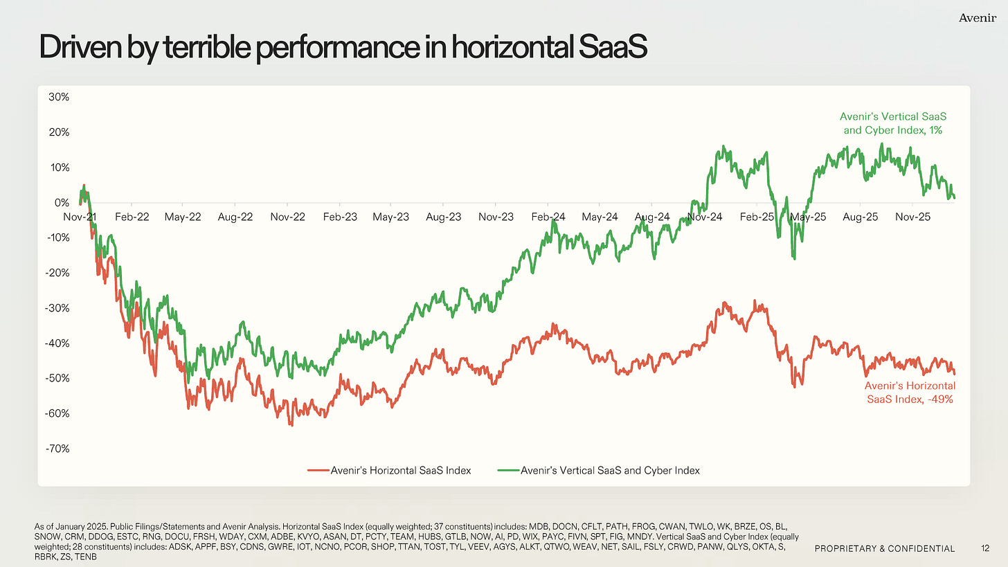 Source: Avenir analysis. Horizontal SaaS Index (37 constituents) vs. Vertical SaaS and Cyber Index (28 constituents). As of January 2026.