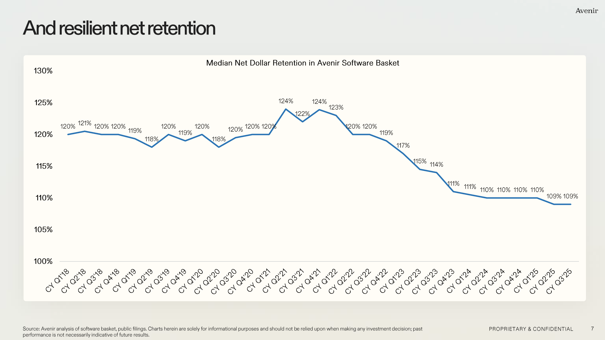 The Avenir data shows this fear is overblown—for now. Net dollar retention has declined from 120% in 2022 to 109% in Q3 2025, but that’s compression, not collapse. Customers are spending less incrementally, but they’re not leaving.
