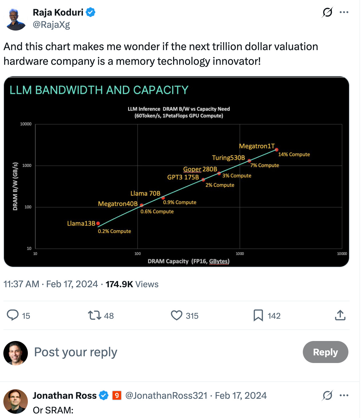 Jonathan Ross—Groq’s CEO—replied with a single word and a logo: “Or SRAM:” followed by the Groq emblem.