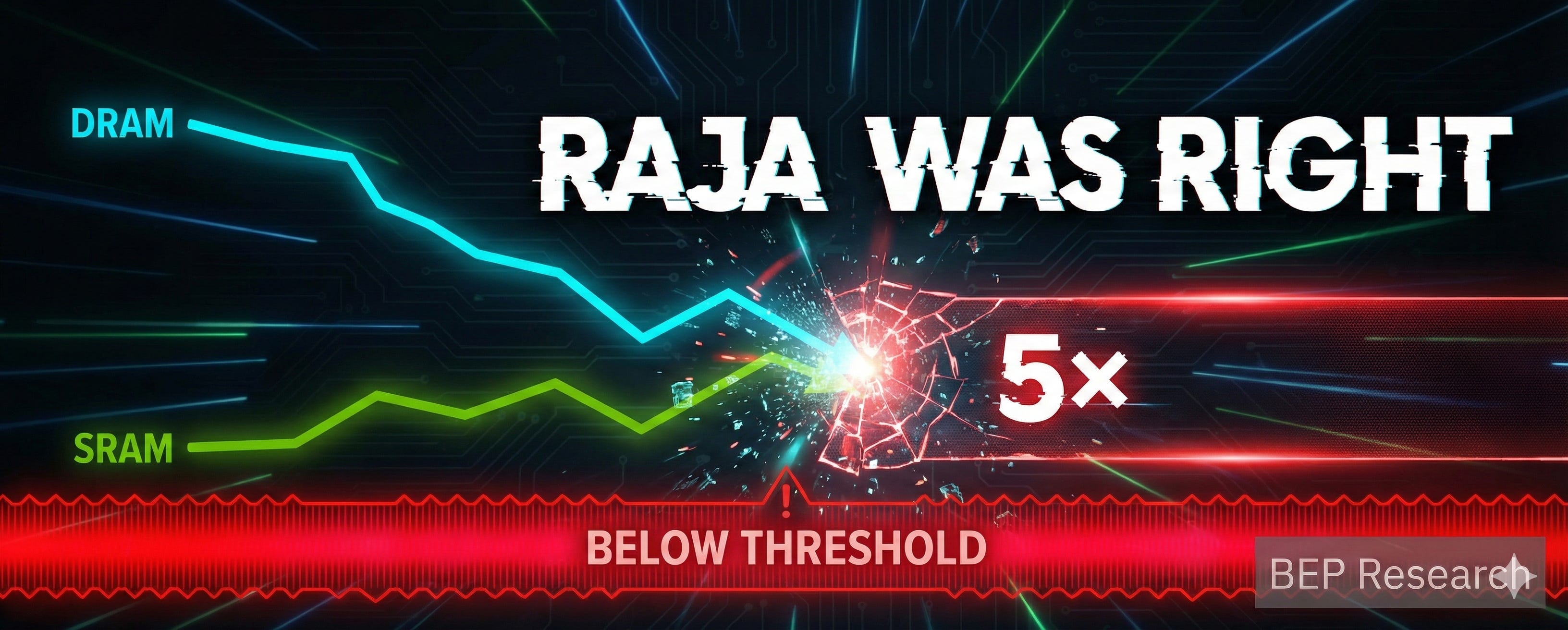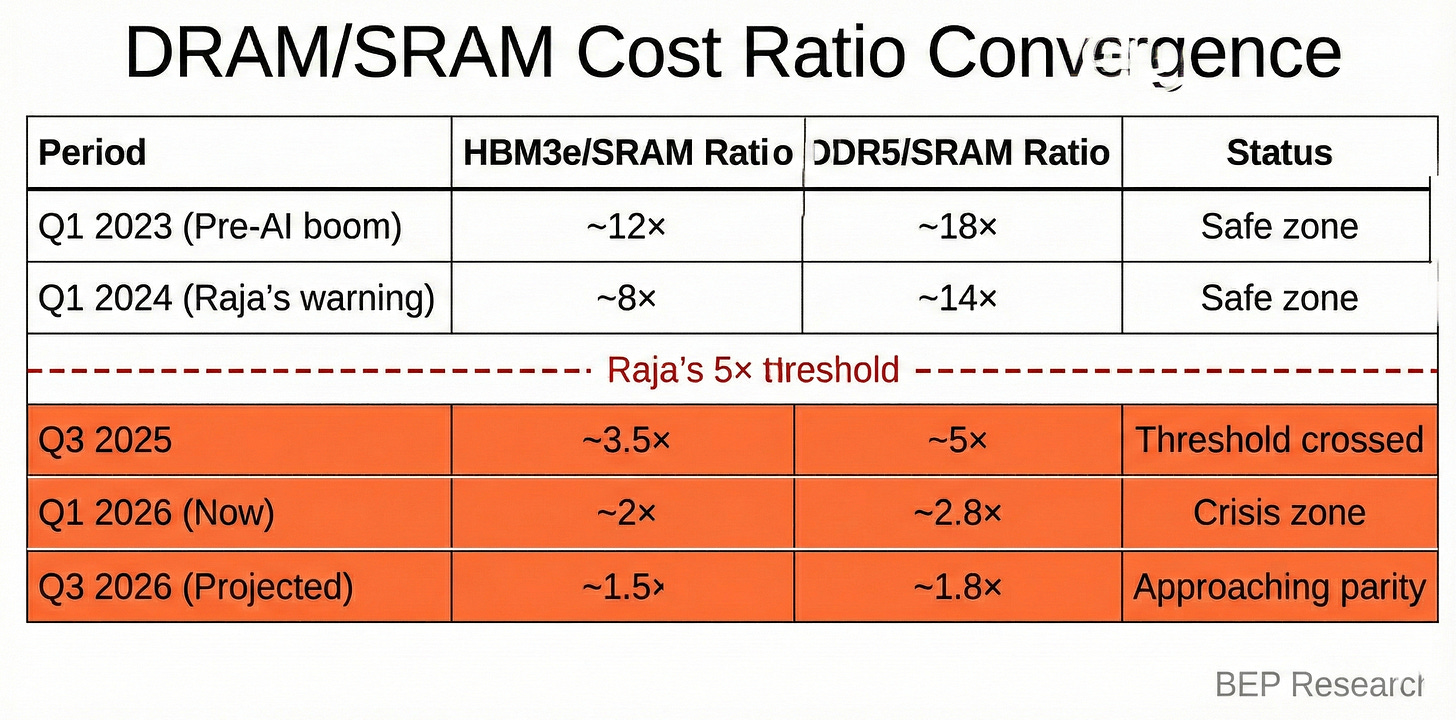 At the time, HBM3e traded at roughly 8× the cost of embedded SRAM per gigabyte. DDR5 server memory sat around 14×. The threshold seemed distant.