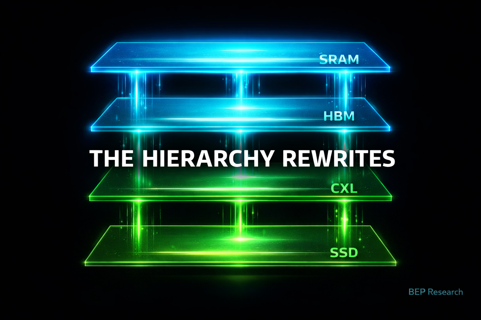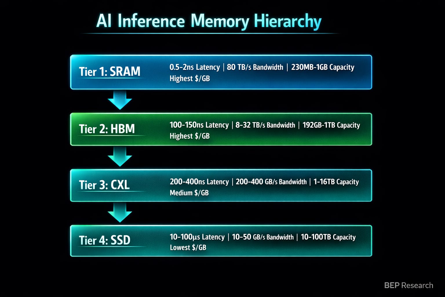 Large-Model Decode: Tiered hierarchy wins. HBM for hot weights, CXL for warm data, SSD for cold context.