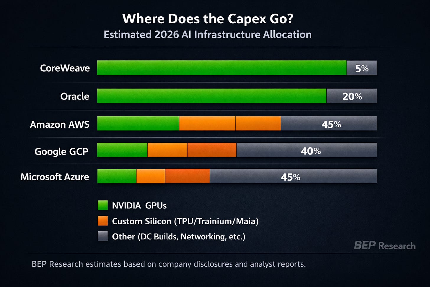 The numbers tell the story. Of Amazon’s $200 billion capex, a meaningful and growing share goes to Trainium and non-GPU infrastructure. Of Google’s $175-185 billion, roughly 60% goes to servers (split between TPUs and GPUs) and 40% to data centers and networking. Microsoft’s Maia program consumes engineering bandwidth and data center floor space. Meta is building custom silicon while simultaneously deploying the largest external NVIDIA GPU clusters.