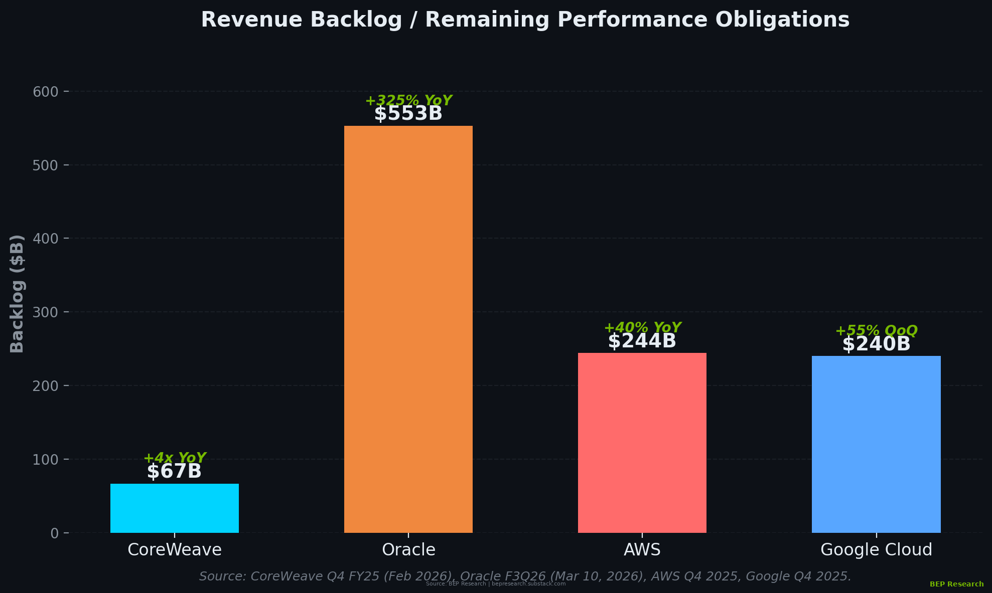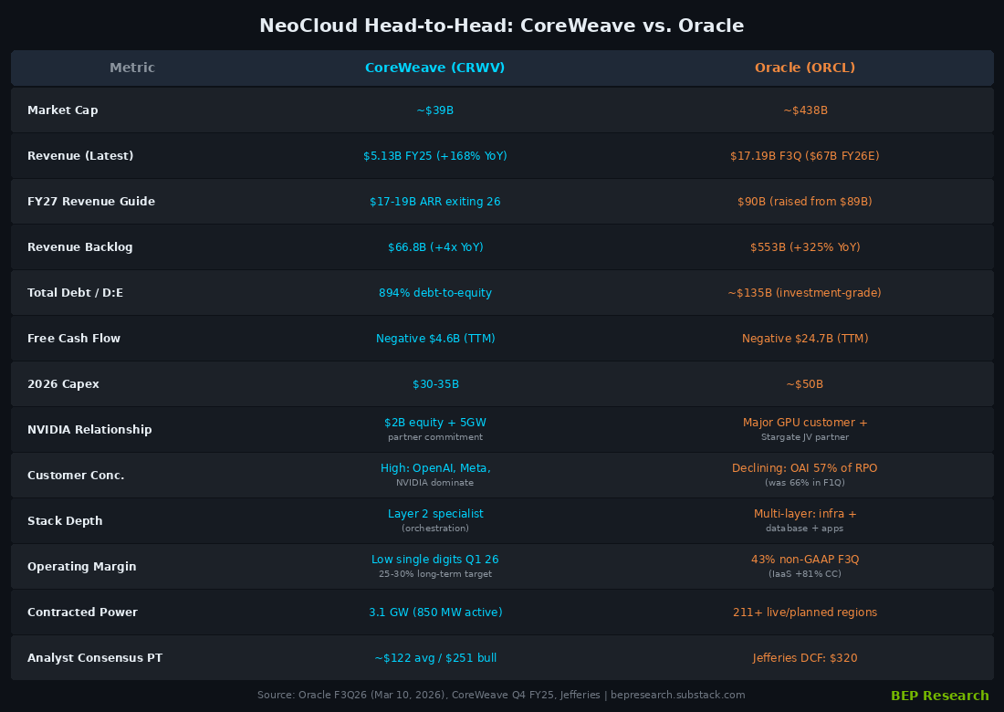 By this definition, the field narrows quickly. CoreWeave is the purest expression: a company that went from crypto mining to the largest independent GPU cloud in under five years, with $66.8 billion in revenue backlog and NVIDIA as both its primary supplier and strategic investor. Oracle is the more complex case: a 49-year-old enterprise software company that Larry Ellison has aggressively repositioned as an AI infrastructure powerhouse, with $553 billion in remaining performance obligations and FY27 revenue guidance just raised to $90 billion.