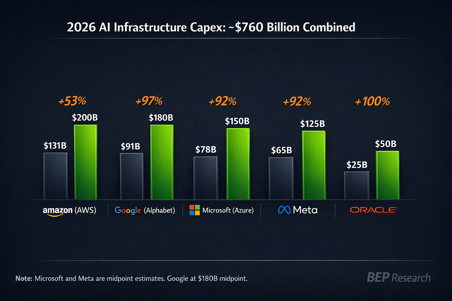 To understand why NeoClouds matter, you have to understand why the hyperscalers are structurally slower at pure NVIDIA GPU deployment, even though they’re spending far more money. The spending is extraordinary. The four largest hyperscalers have guided to approximately $710 billion in combined 2026 capex: Amazon at $200 billion, Alphabet at $175-185 billion, Microsoft at roughly $150 billion, and Meta at $115-135 billion. Add Oracle’s $50 billion, and you’re approaching $760 billion in a single year.