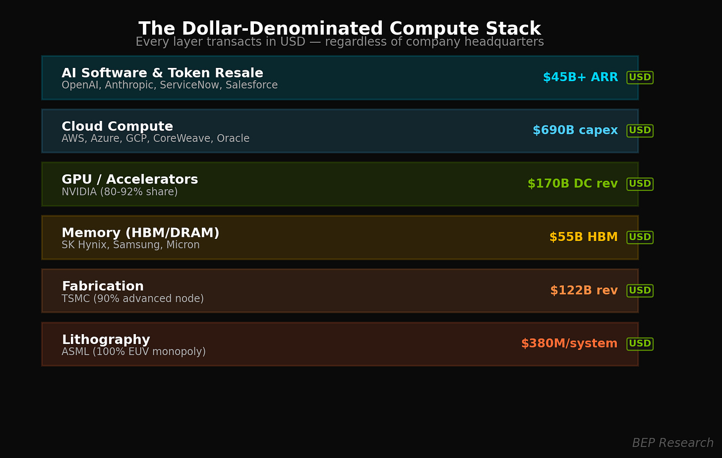 I want to be precise about what “American-controlled” means here — because the obvious objection is that TSMC is Taiwanese and SK Hynix is Korean. That’s true. But the Token Dollar thesis doesn’t require every company to be headquartered in America. It requires every transaction to settle in dollars. And they do. TSMC prices exclusively in USD. SK Hynix sells HBM in dollars. ASML sells EUV systems in dollars. The entire supply chain, regardless of where a company’s headquarters sits, transacts in American currency.