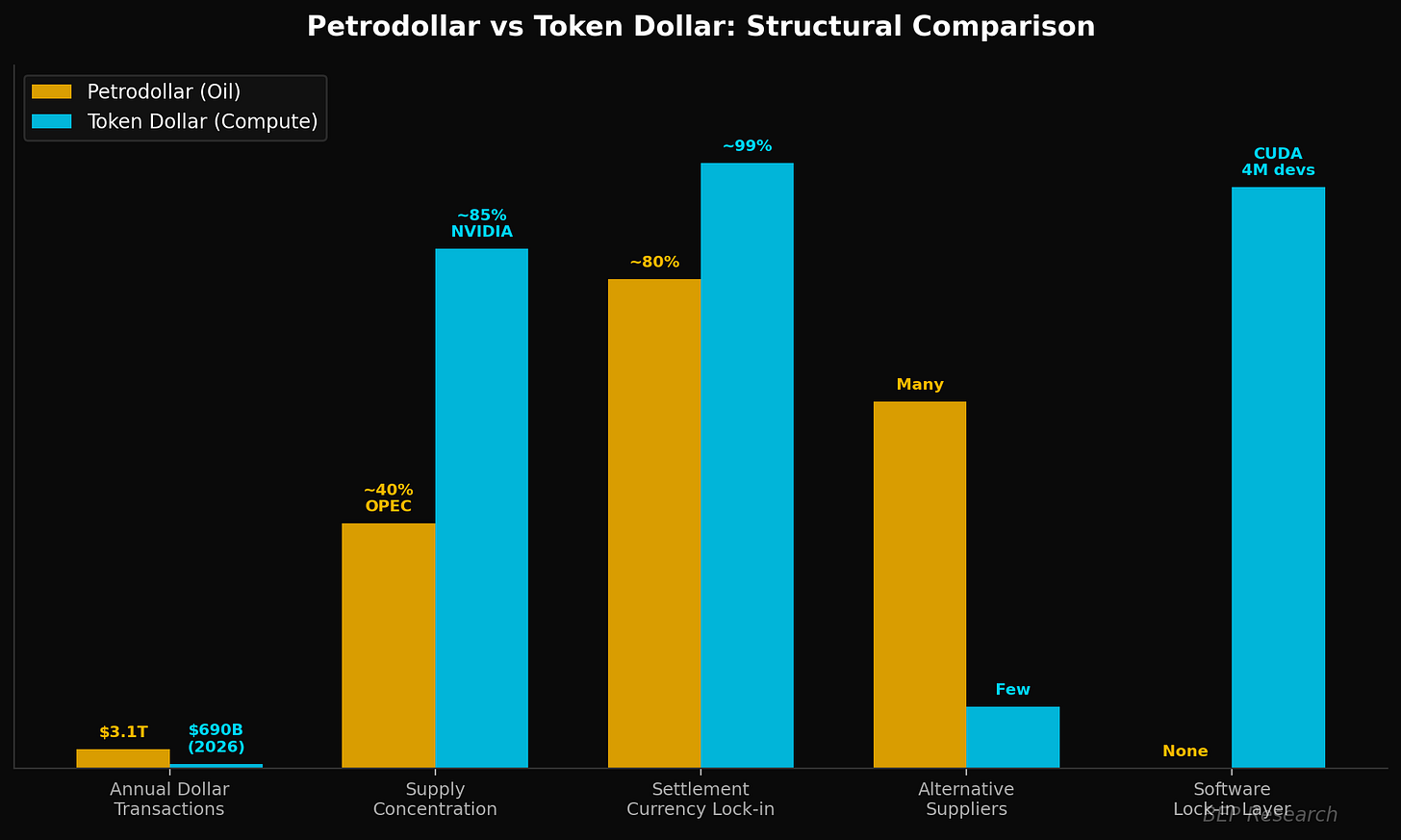 The mechanism is what matters. The Token Dollar thesis is simple: if the world’s most important new industrial input is AI compute, and the chokepoints that produce it are priced in dollars, then rising global demand for compute reinforces dollar demand the way oil once did. The difference is that the compute chokepoint stack is more concentrated than oil ever was, the demand curve is self-reinforcing through Jevons paradox dynamics, and there is no strait that anyone can close.